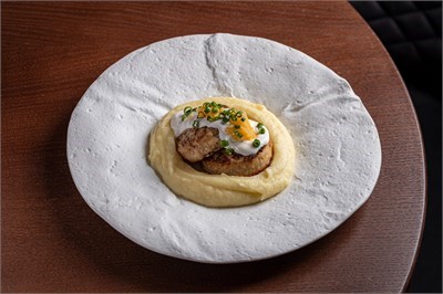 Фарш из щуки, картофельное пюре, сливки 33%, сметана, икра щуки, лук сибулет.