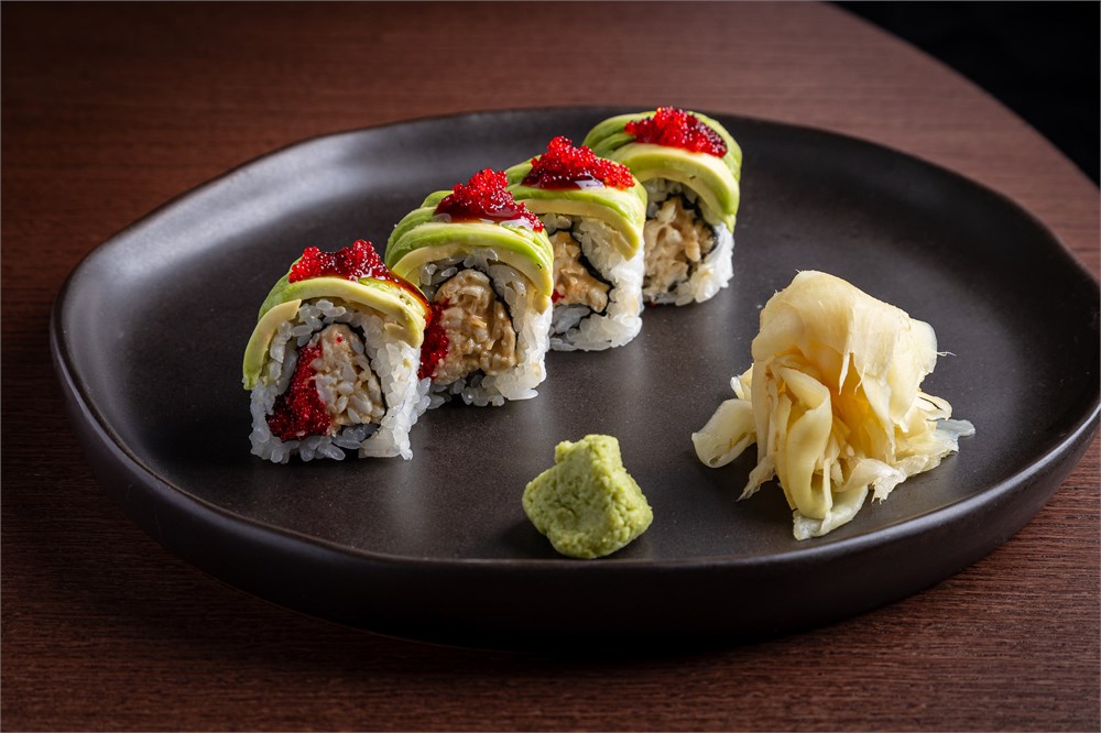 Мясо краба, авокадо, водоросли нори, васаби порошок, имбирь маринованный, соевый соус, икра тобико, майонез, рис для суши: рис для суши, уксус рисовый, соль, сахар, лимонный фреш, сок юдзу. Соус юдзу унаги: соус юдзу, соус унаги.