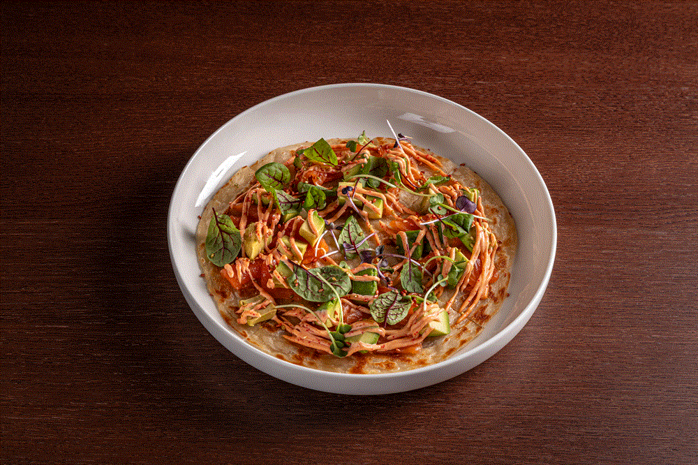 лепешка роти,лосось с/с, авокадо,масло трюфельное,соус спайси,лук зеленый,икра тобико.